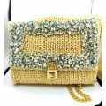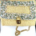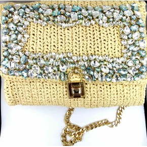 Μια χειροποίητη τσάντα φτιαγμένη με πλαστική raffia.Με επίχρυσες λεπτομέρειες και αλυσίδα.Δερμάτινη επένδυση εσωτερικά και ραμμένες κρυστάλλινες χάντρες Τσεχίας.Και φυσικά εξωτερικά με χάντρες από κρύσταλλα Swarovski σε διάφανο και γαλάζιο χρώμα.