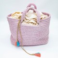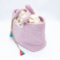Bag with pink thick cord. It closes like a pouch and has two pink-blue tassels at the ends.