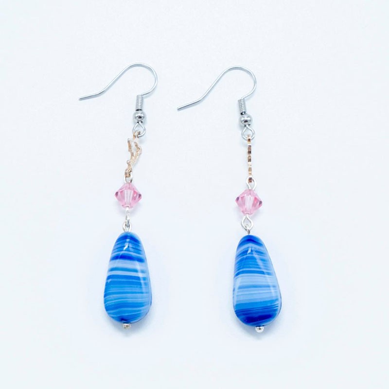Earrings with semiprecious stones in blue. Pink Swarovski in which there are silver little dolphins, very discreet. As well as a silver clasp.