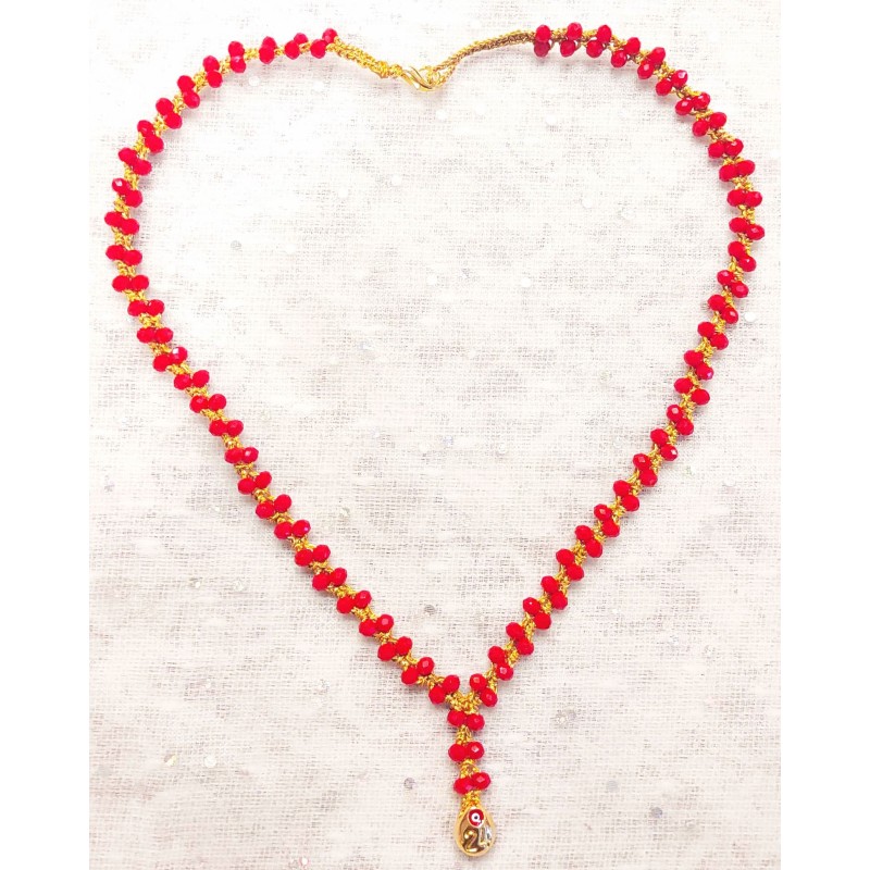 Necklace hand woven with gold thread with red crystals. Gold-plated hanging element.