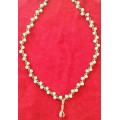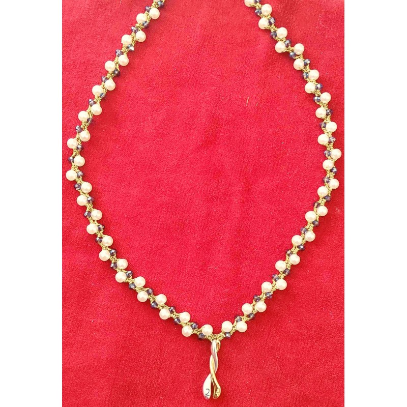 With pearls and purple crystals. Two elements silver and gold plated. Hand knitted with gold thread.