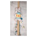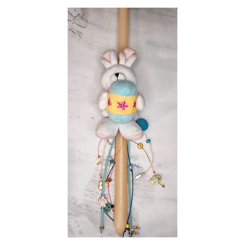 Handmade candle with bunny and an egg. Various elements, metal, porcelain and glass, hang from the ribbons.
