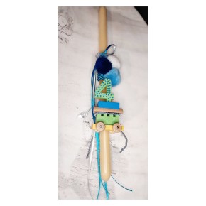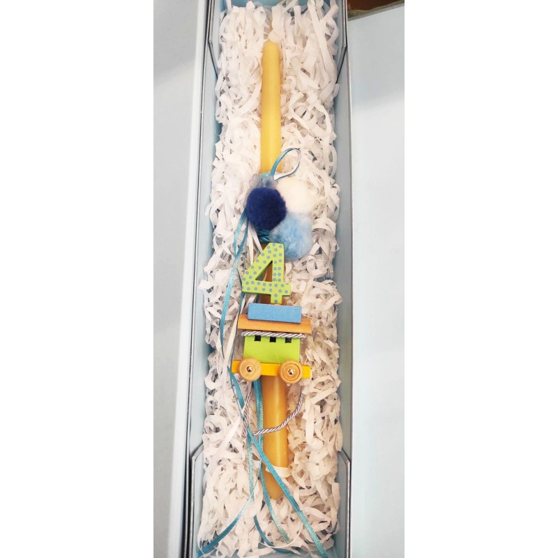 Handmade classic candle with colorful pom-poms. Trolley and the number 4. The candle comes in a blue metallic box.