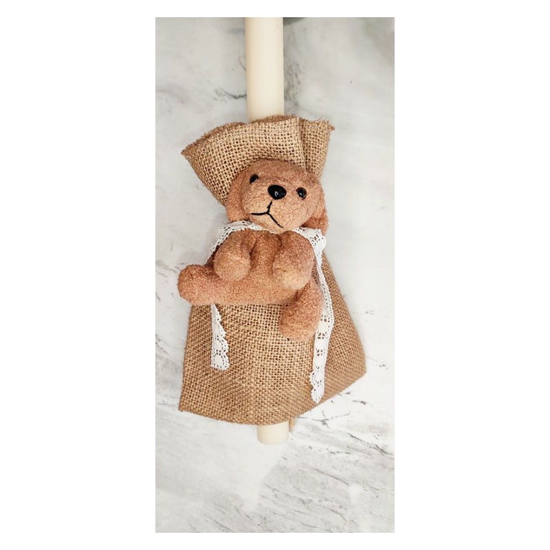 Handmade round thick candle with burlap and a dog.