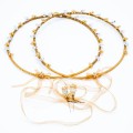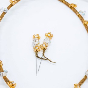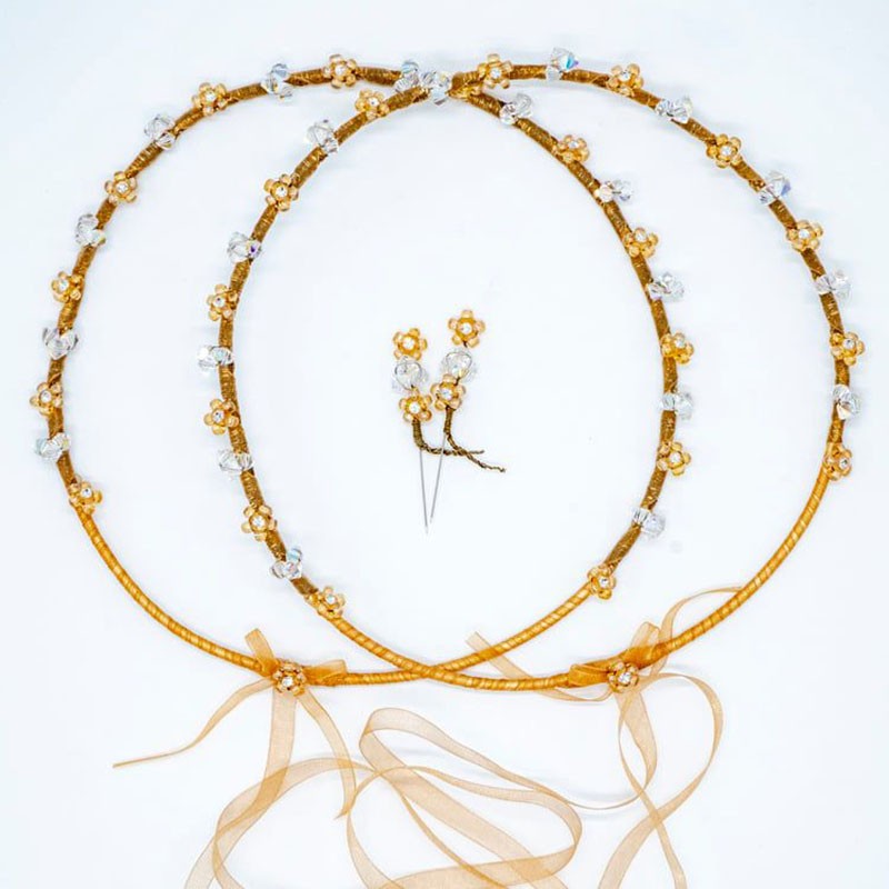 Thick 2mm gold-plated wire. It is lined with gold delicate organza. The crowns are braided with antique wire. Flowers which are made of transparent Swarovski. Crystals in golden hue with zirgon rhinestones. The set consists of two pins, for the lapel of the jacket with the same design.