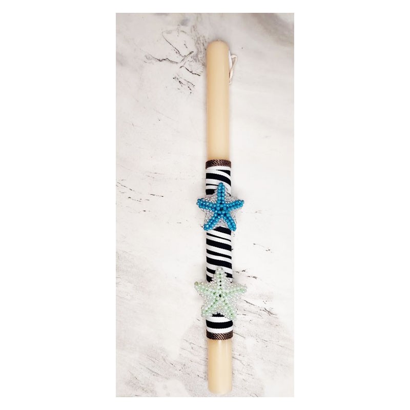 Χειροποίητη λαμπάδα στρογγυλή με αστερίες φτιαγμένοι με χάντρες.