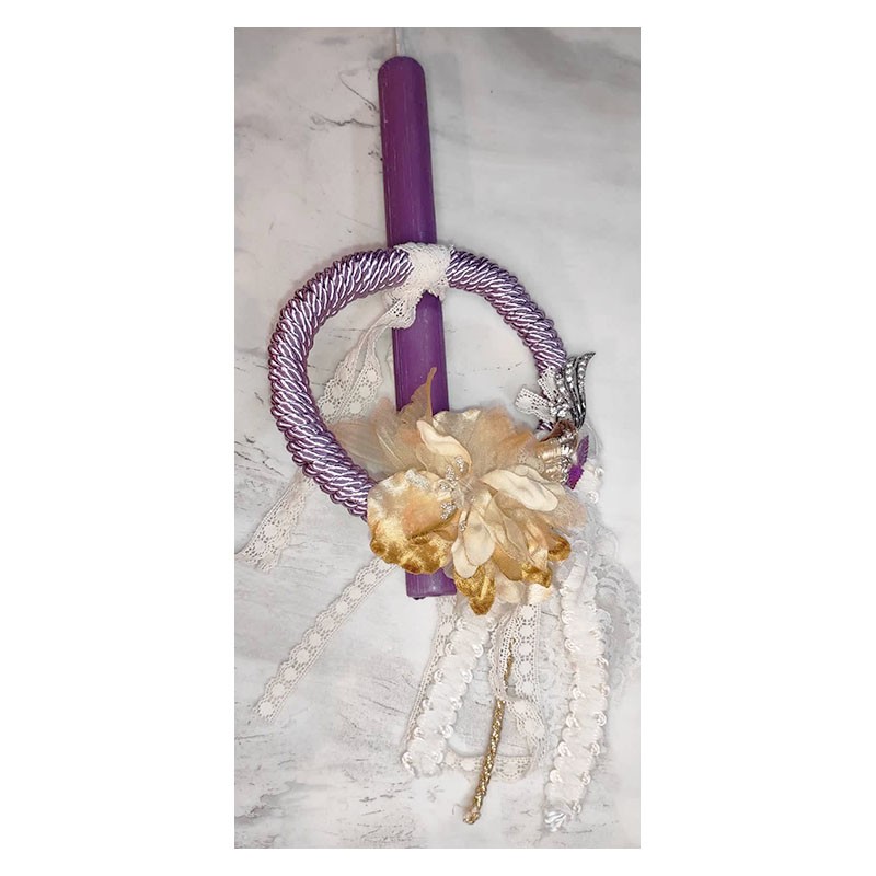 Χειροποίητη λαμπάδα στρογγυλή κοντή με ένα υπέροχο στεφανάκι με κορδέλες και λουλούδι υφασμάτινο.Στην άκρη έχει μία υπέροχη καρφίτσα ασημένια.