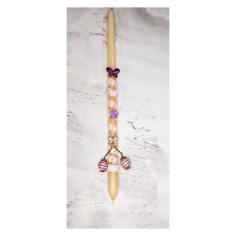 Χειροποίητη λαμπάδα κλασική με πεταλούδες,λουλουδάκια και διάφορα άλλα στοιχεία.