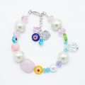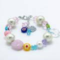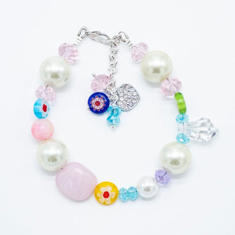 Βραχιόλι με πέρλες, με ημιπολύτιμους λίθους. Ασημένια στοιχεία ,κρύσταλλα σε δάφορα χρώματα και μεγέθη. Millefiori και μια ασημένια καρδούλα με στράς που κρέμεται από το κούμπωμα.