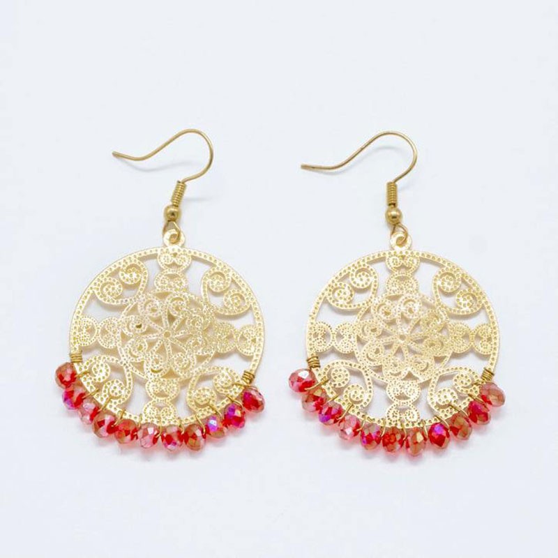 Επίχρυσα σκουλαρίκια με στρόγγυλο σκαλιστο, επίχρυσα κουμπώματα και κόκκινες χάντρες απο κρύσταλλα.