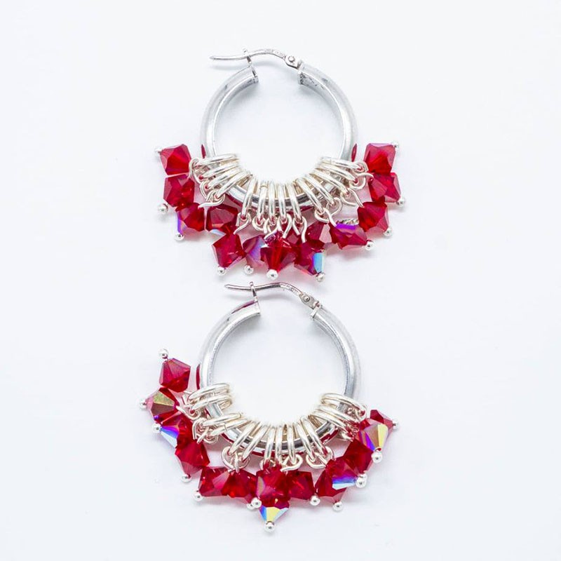Σκουλαρίκια κόκκινα με Swarovski με ασημένια στοιχεία και ασημένιους κρίκους.